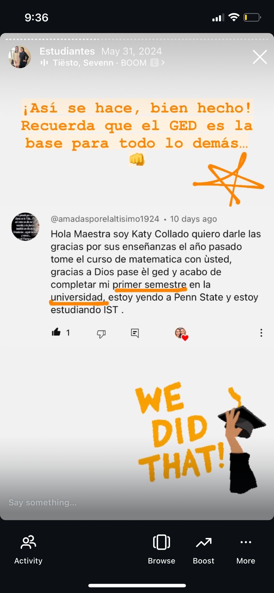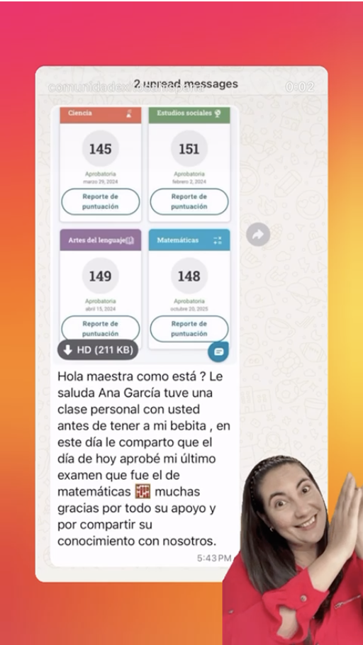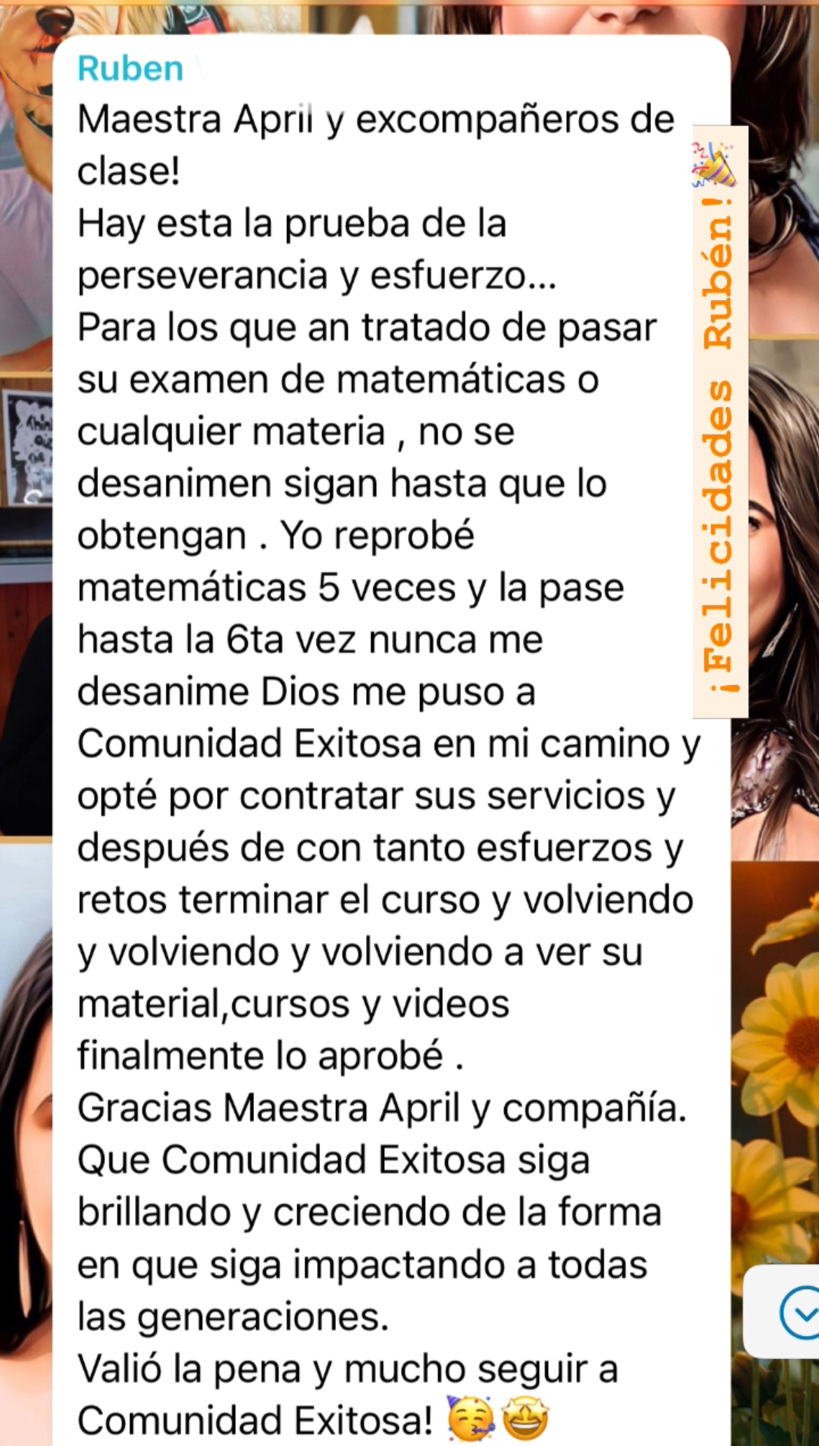 Recomiendo a Comunidad Exitosa al %. Yo tenía años tratando de estudiar para obtener mi GED. Un día buscando videos en YouTube me crucé con un video de la maestra April y me encantó su manera de explicar. Vi todos sus videos de YouTube y me quedé con hambre de aprender más. Para mi buena suerte, me di cuenta que tenían cursos privados y tomé la decisión de inscribirme. Es la mejor decisión que pude haber tomado. Muchísimas gracias maestras April y Tamy.
